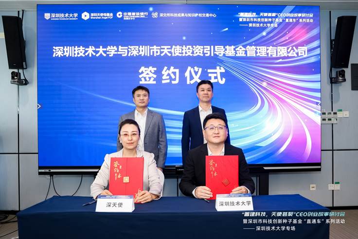 首先深技大与深天使举办了正式的签约仪式。我校科研与校企合作部主任吴旭教授、深天使协同发展部副总经理常慧莉进行签约,我校党委书记陈秋明、深天使副总经理刘湘宁见证。本次战略合作签约不仅为双方开启“产学研资”合作奠定扎实基础,更有利于优秀科学技术成果转化、孵化和投资,实现从赋能科技成果转化的“最后一公里”与开启创业的“第一公里”。
