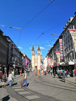 跨过老美因桥,即是维尔兹堡市中心。这座古城人虽不多,但在这中心区却永远热闹非凡,这里仿佛一个购物中心,只要有心去逛,琳琅满目的商品定能让你满意。而在纵横交错的街道,即便口味再挑剔,也一定能找到一份属于自己的美食。