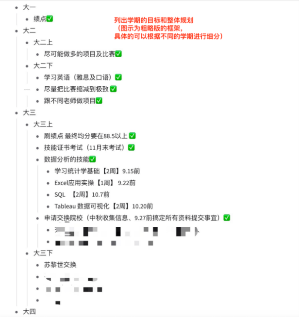 首先是要解决一个问题“我想要干什么?我想要完成怎样的一个阶段性目标?”如果你知道自己想要什么,那么其实80%的主要矛盾就已经解决了,我是根据自己不同的学期来写一个整体的目标框架作为我这个学期的“最高目标”。